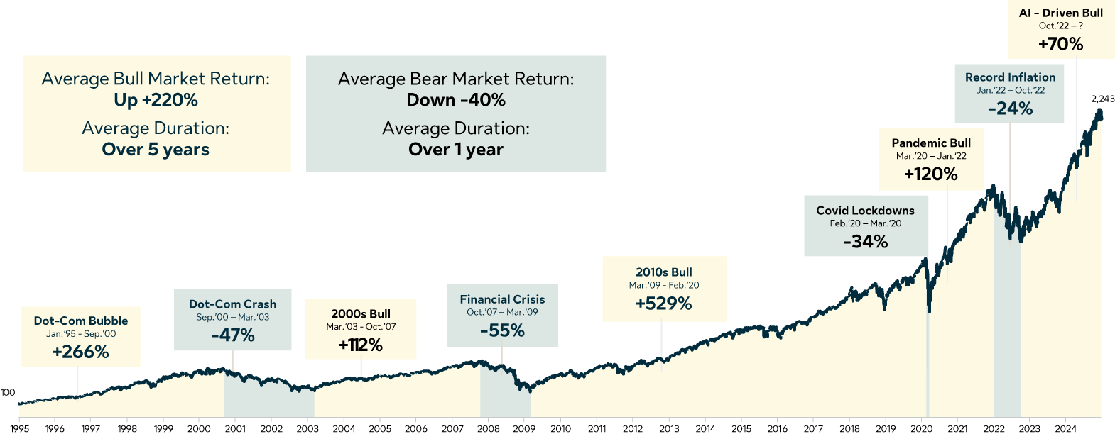This example is for illustrative purposes only and is not intended to be representative of the performance of any actual or future investment available to investors. It is not possible to invest directly in an index. Returns are calculated in U.S. dollars and assume reinvestment of all income and no transaction costs or taxes for the period January 1, 1985 to December 31, 2024. Actual returns would be different due to fees and expenses associated with investing which are not applicable to an index. For purposes of this illustration, a bear market is defined as an index falling at least 20% from a previous high.