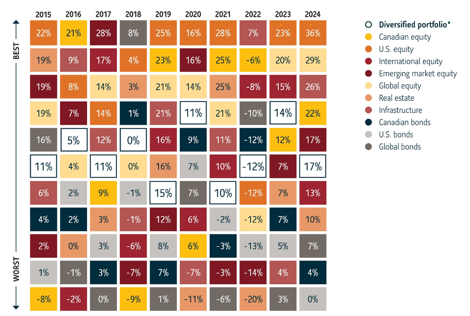 Equity returns are represented by the following indices in C$ terms and include reinvestment of dividends: U.S. stocks: S&P 500 Total Return Index; Canadian equities: S&P/TSX Capped Composite Total Return Index; International equities: MSCI EAFE NR Index; Emerging market equities: MSCI EM Net Return Index; Global equities: MSCI World Net Return Index; Real estate: FTSE EPRA/NAREIT Developed Index; Infrastructure: S&P Global Infrastructure Total Return equities; Canadian bonds: FTSE Canada Universe Return Index; U.S. bonds: Bloomberg U.S. Aggregate Total Return Hedged Index; Global bonds: Bloomberg Global Aggregate Total Return Index. The performance of each index including the diversified portfolio is provided to illustrate historical market trends; it does not represent the performance of a particular Sun Life Global Investments product. Source: Morningstar. Data as of December 31, 2024.