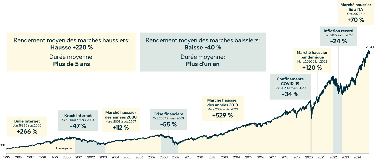L’exemple est fourni à titre indicatif seulement et n’est pas représentatif du rendement de tout placement actuel ou futur offert aux investisseurs. Il n’est pas possible d’investir directement dans un indice. Les rendements sont calculés en dollars américains et tiennent compte du réinvestissement de tous les revenus et non des frais d’opération et de l’impôt pour la période du 1er janvier 1995 au 31 décembre 2024. Le rendement réel serait différent, car les placements donnent lieu à des frais qui ne s’appliquent pas dans le cas d’un indice. Pour les besoins de cet exemple, un marché baissier s’entend d’un indice qui perd au moins 20 % par rapport à son sommet précédent.
