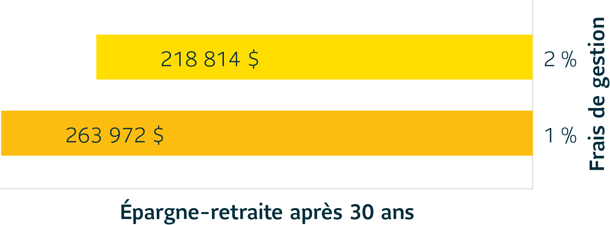 En payant des frais de gestion de 2 % pendant 30 ans sur votre épargne-retraite, vous accumulerez 218 814 $. Si vos frais sont de 1 %, vous accumulerez 263 972 $.