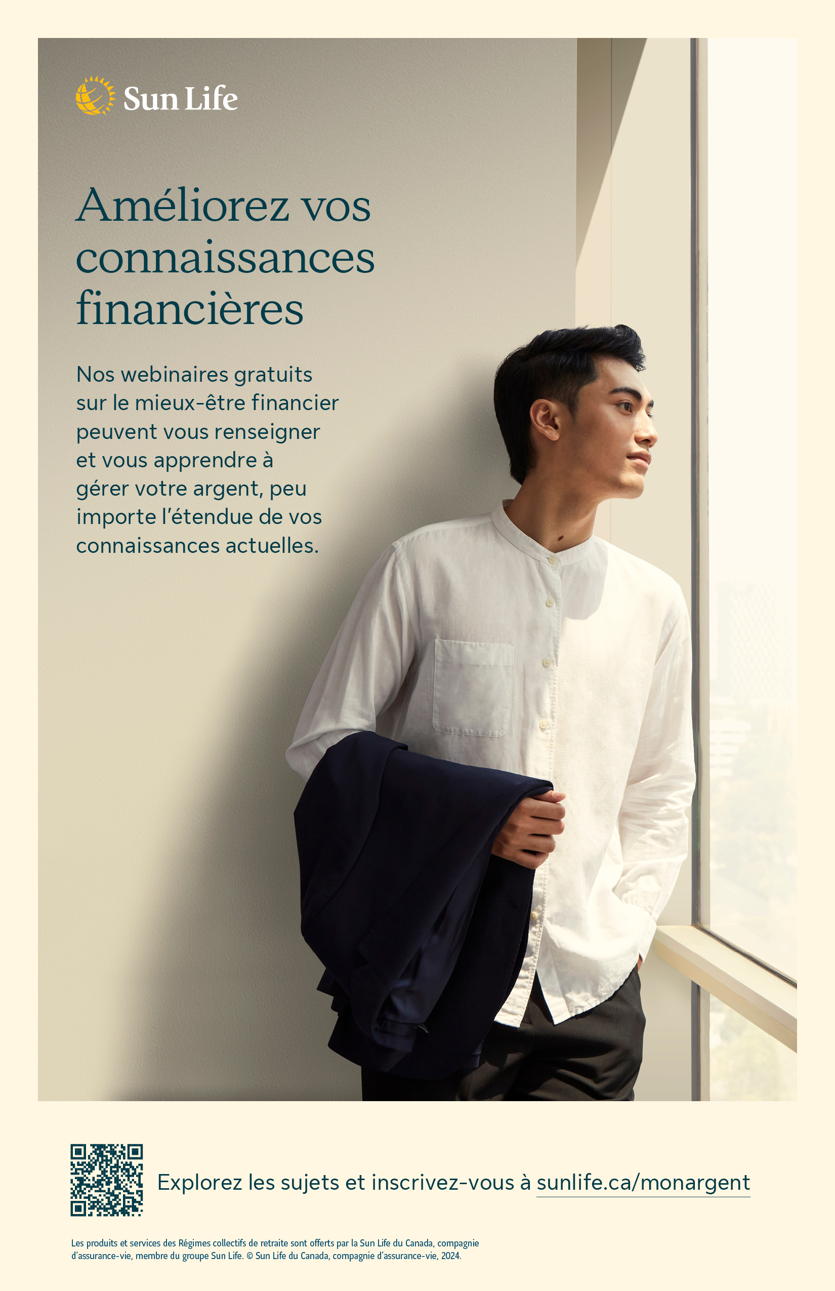 Rendez-vous au sunlife.ca/monargent pour connaître les sujets, les dates et les heures des webinaires. Vous y trouverez aussi l’information concernant l’inscription pour le reste de 2024 et les deux premiers trimestres de 2025.